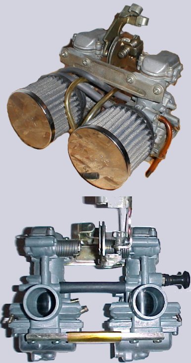| Carburateurs avec commande "desmodromique": boisseaux commandés par deux leviers reliés à une poulie (et 2 cables: un qui pousse pour fermer les boisseaux et un qui tire pour les ouvrir) pour les USA et quelques modèles Japonais. Le chapeau des carburateurs n'est pas vissé mais flasqué par 3 vis. Les 2 carburateurs sont fixés entre-eux par des pattes. Les aiguilles ne sont pas réglables et seulement l 'aiguille d'origine est disponible pour que les propriétaires ne puissent pas faire d' autres réglages afin que le système catalytique fonctionne bien et respecte le niveau de pollution homologué par l 'EPA (Environmental Protection Agency) comme nous pouvons le voir sur cet autocollant sur la moto. | |