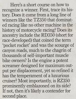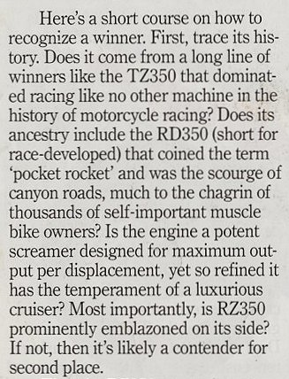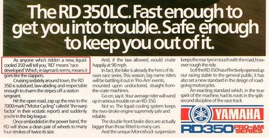 This bike is wonderfull because it gives many sensation, due to it 2 stroke engine with a very good ratio power / weight, easy handling, sound, smell and the fun you have when you ride it ! The RD/RZ350LC's are always a good remember in the memory of a bike rider who owned one !!! This is a very popular model and still appreciated: there are some 350LC clubs in France, UK, Italia, Holland, Brazil...! In the USA, due to stric pollution law, it was the last street legal 2 stroke bike !