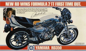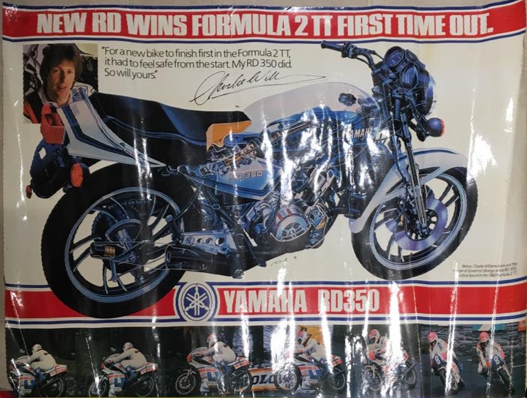 Poster de concessionnaire YAMAHA suite à la victoire au TT (Tourist Trophy) de la RD350LC en catégorie Formula 2 en juin '80 avec Charlie Williams ! L'importateur Anglais Yamaha Mistui assembla le moteur et les échappement d'une 4L0 dans un chassis de TZ. |