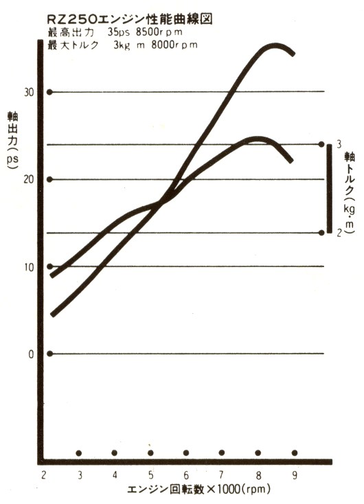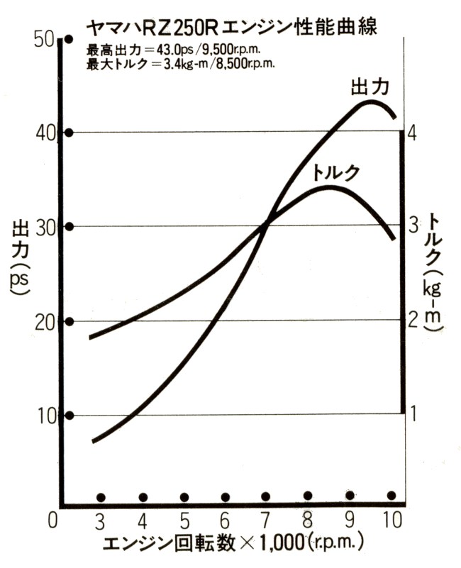 | '84 YPVS | 45 hp @ 9500 rpm / 3.5m.kg @ 9000 rpm |