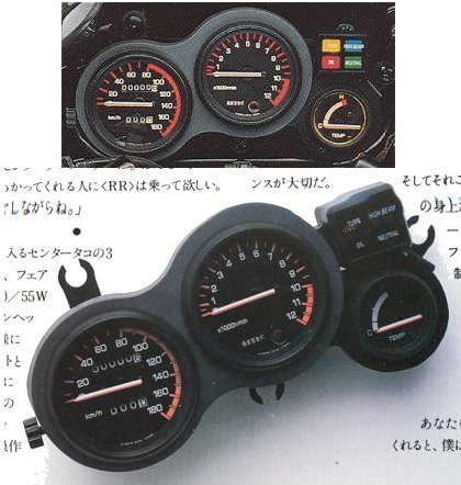 | Voyant d'alerte de vitesse limite( à 80 km/h !!) et zone rouge dans le compteur de vitesse pour le Japon de '80 à '84 et après '84 (voyant dans le compte tours). | |