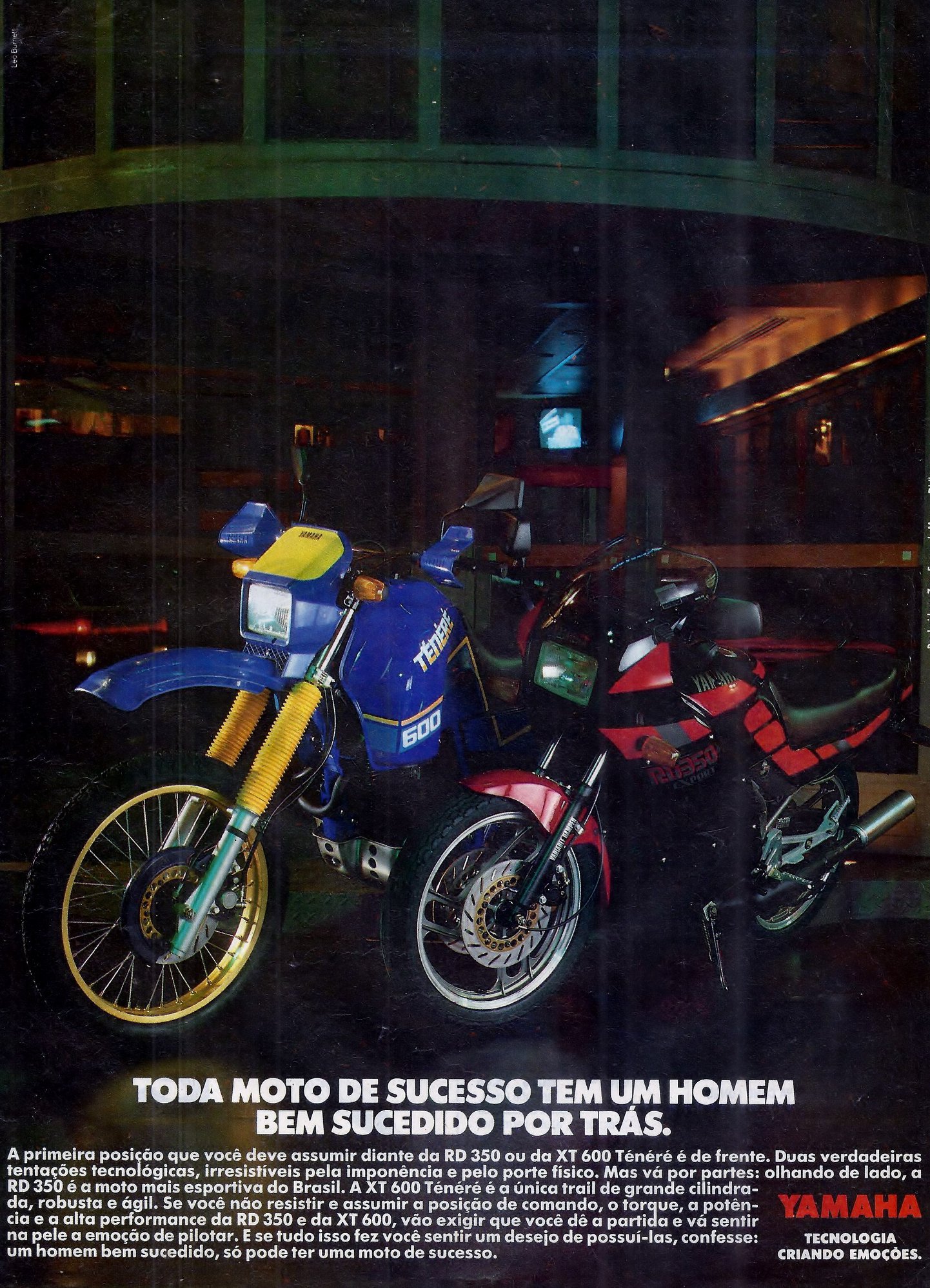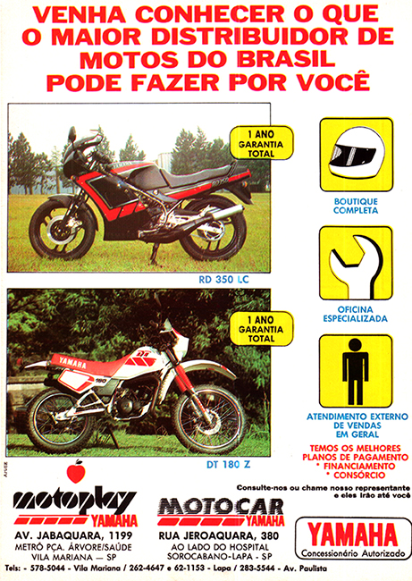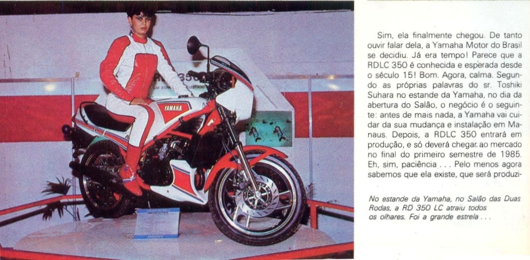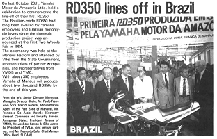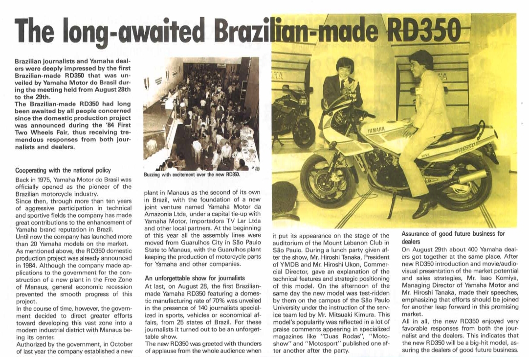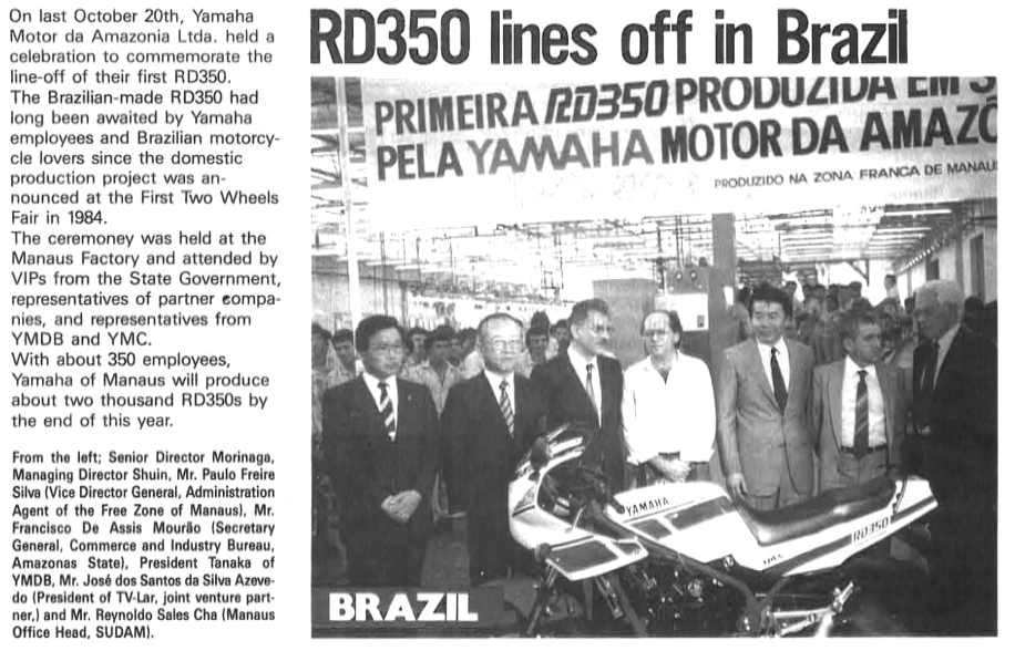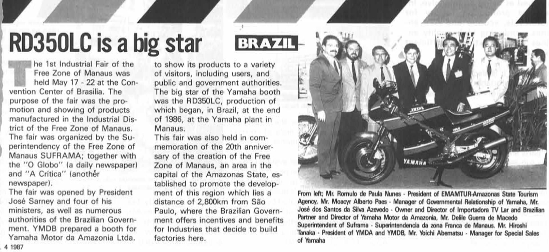 End of '86, YAMAHA MOTOR DA AMAZÔNA start to sold the RD350LC in Brazil. The RD 350 LC/R were built and sold in BRAZIL until '93 bringing the last evolutions of the 350 in the world: the twin headlight fairing model (completely closed like first HONDA CBR 600) which was launched in '91. Production stopped in '93 but the last models were sold in UK until '95.